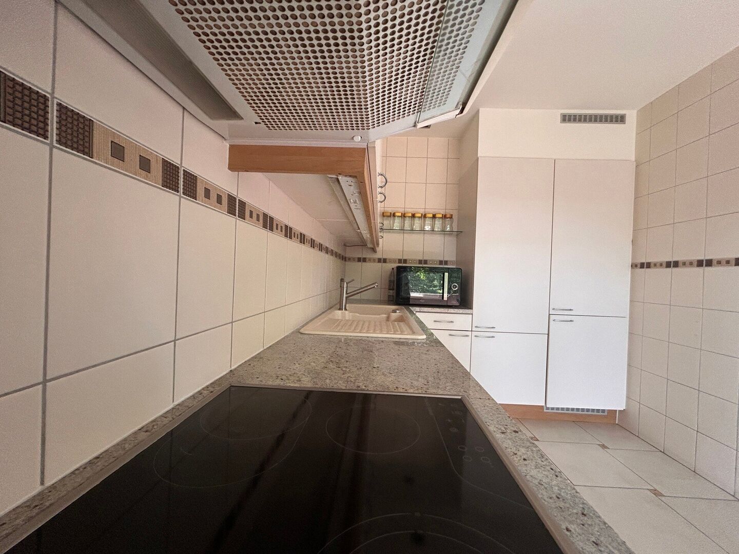 Inkomhal met grote vestiarekast en gastentoilet. Lichtrijke leefruimte met mooi zicht op de parktuin, volledig ingerichte keuken op keramische tegel.