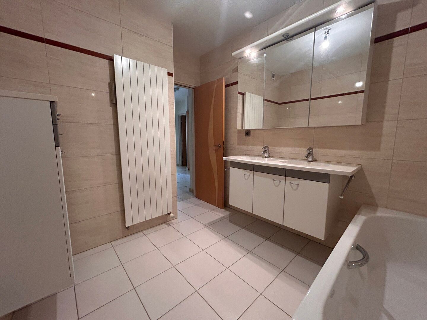 Via de nachthal toegang tot een ruime badkamer met ligbad, wastafel in meubel en aansluiting voor wasmachine.