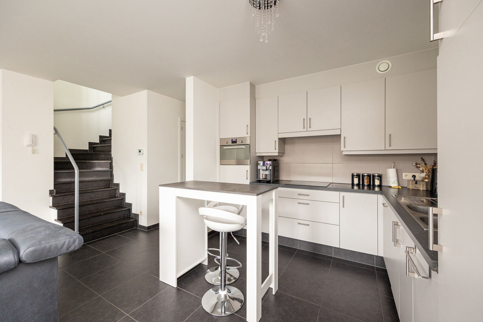 De open keuken is volledig uitgerust met een vitro keramische kookplaat, afzuigkap, combi-microgolfoven, vaatwasmachine en koelkast, en vormt het hart van de woning ideaal voor wie graag kookt en tegelijk contact houdt met familie of gasten.