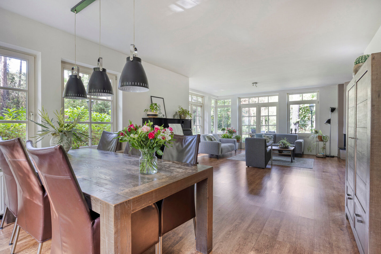 De twee openslaande tuindeuren versterken het wooncomfort en creëren een natuurlijke overgang naar de tuin. Zo wordt het buitenleven een verlengstuk van uw woonkamer en geniet u optimaal van de groene omgeving.