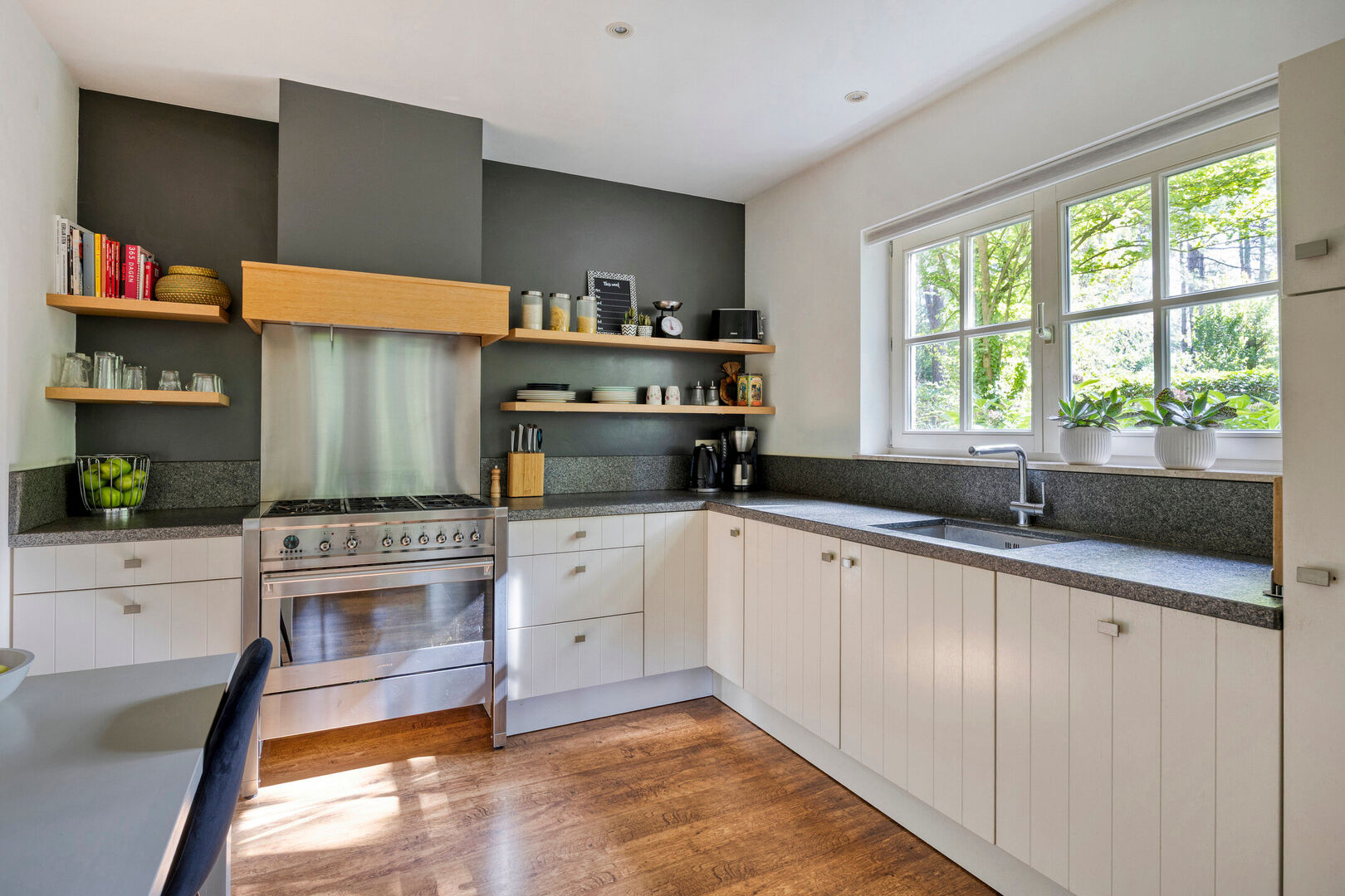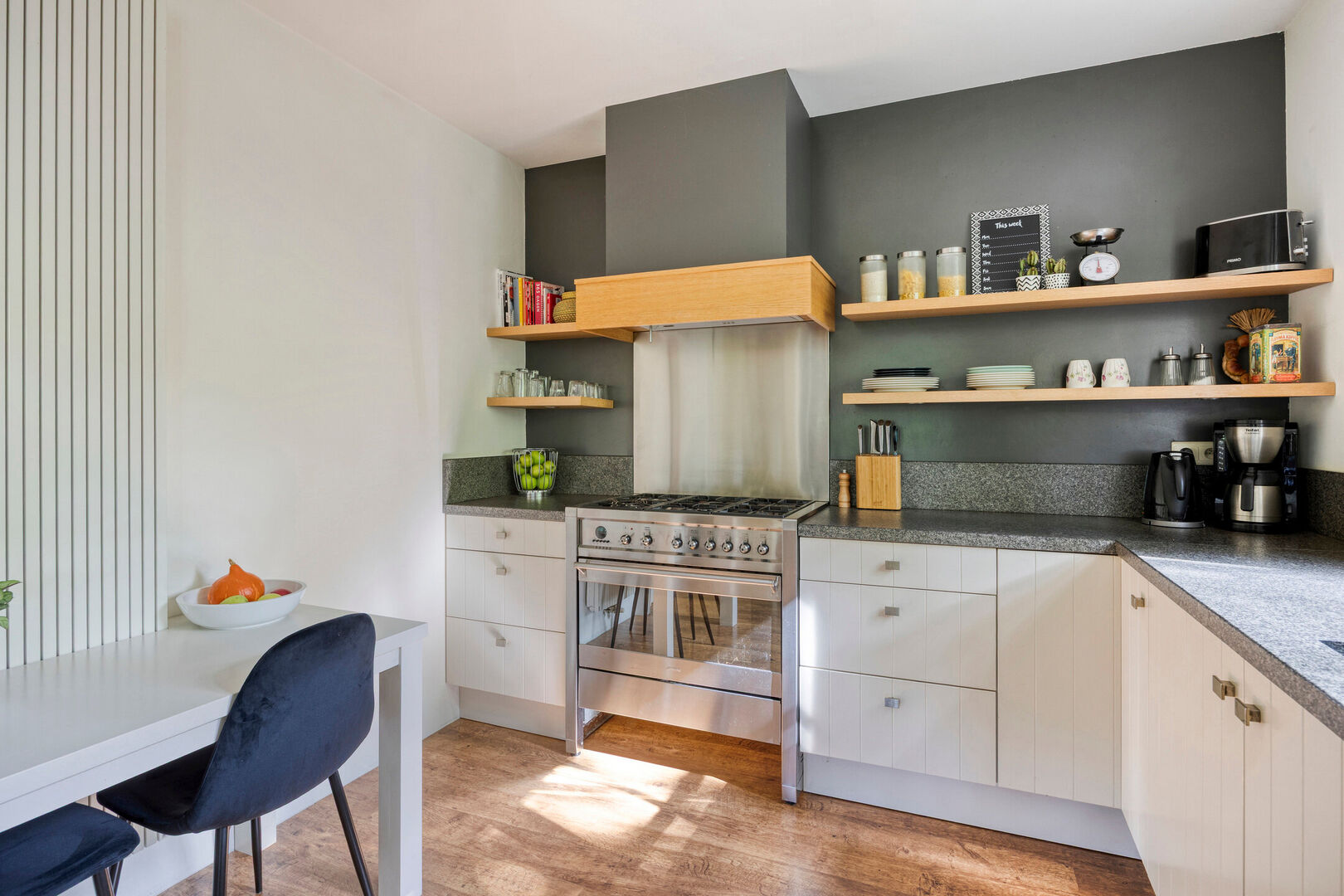 De open keuken ,voorzien van natuurstenen blad, is uitgerust met de nodige toestellen, waaronder een 6-pits gasfornuis met oven, vaatwasser, dampkap en koelkast en staat in directe verbinding met de woonkamer. Vanuit de keuken heb je een fraai zicht op de tuin, waardoor koken hier echt een plezier wordt. De open indeling zorgt bovendien voor een aangename interactie tussen keuken en leefruimte.