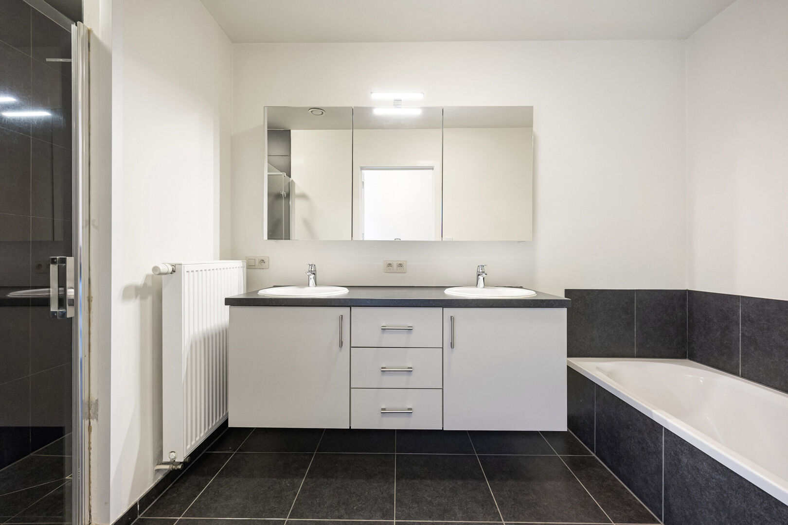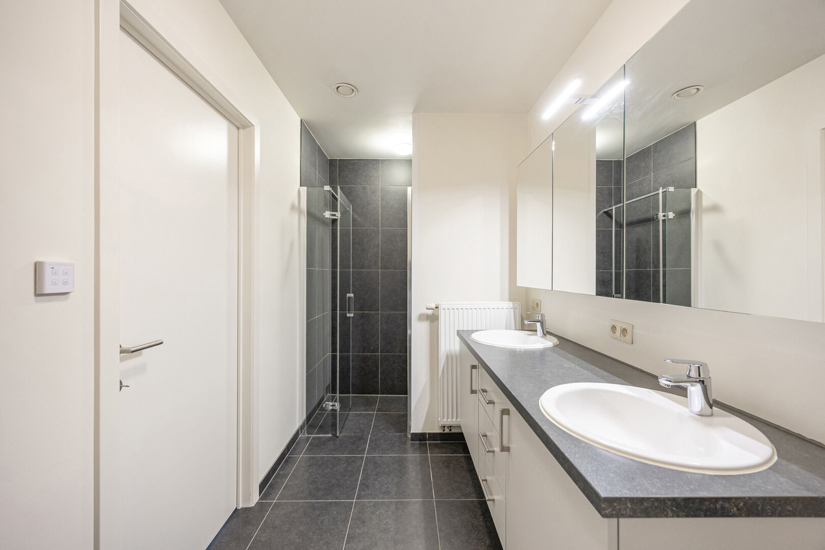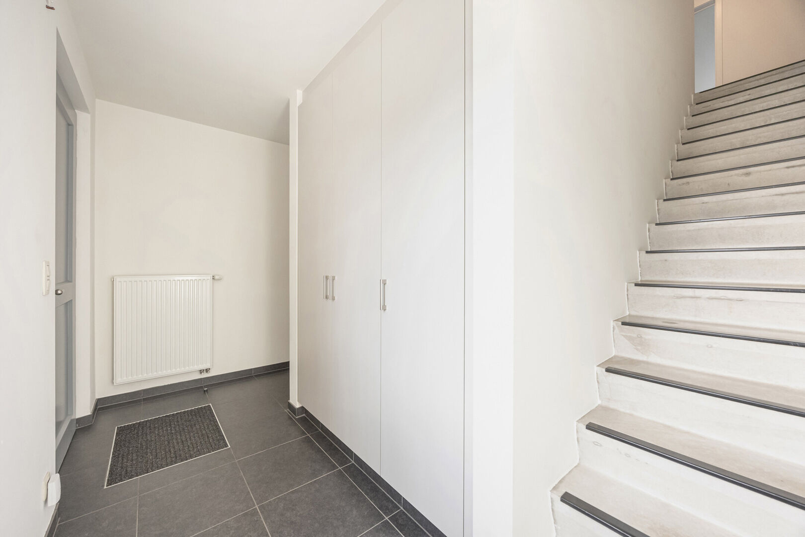 Via de voordeur stapt u de inkomhal binnen. De strakke afwerking, het gebruik van neutrale kleuren en de moderne binnendeuren zetten de toon voor de rest van de woning. In de hal vind u het toilet met fontein, de garderobekast en toegang tot de woonkamer met open keuken. Zodra u de woonkamer binnenkomt, valt het direct op hoe licht en ruim deze leefruimte is. Dankzij de raampartijen en de dubbele openslaande tuindeuren komt er een zee van daglicht binnen.