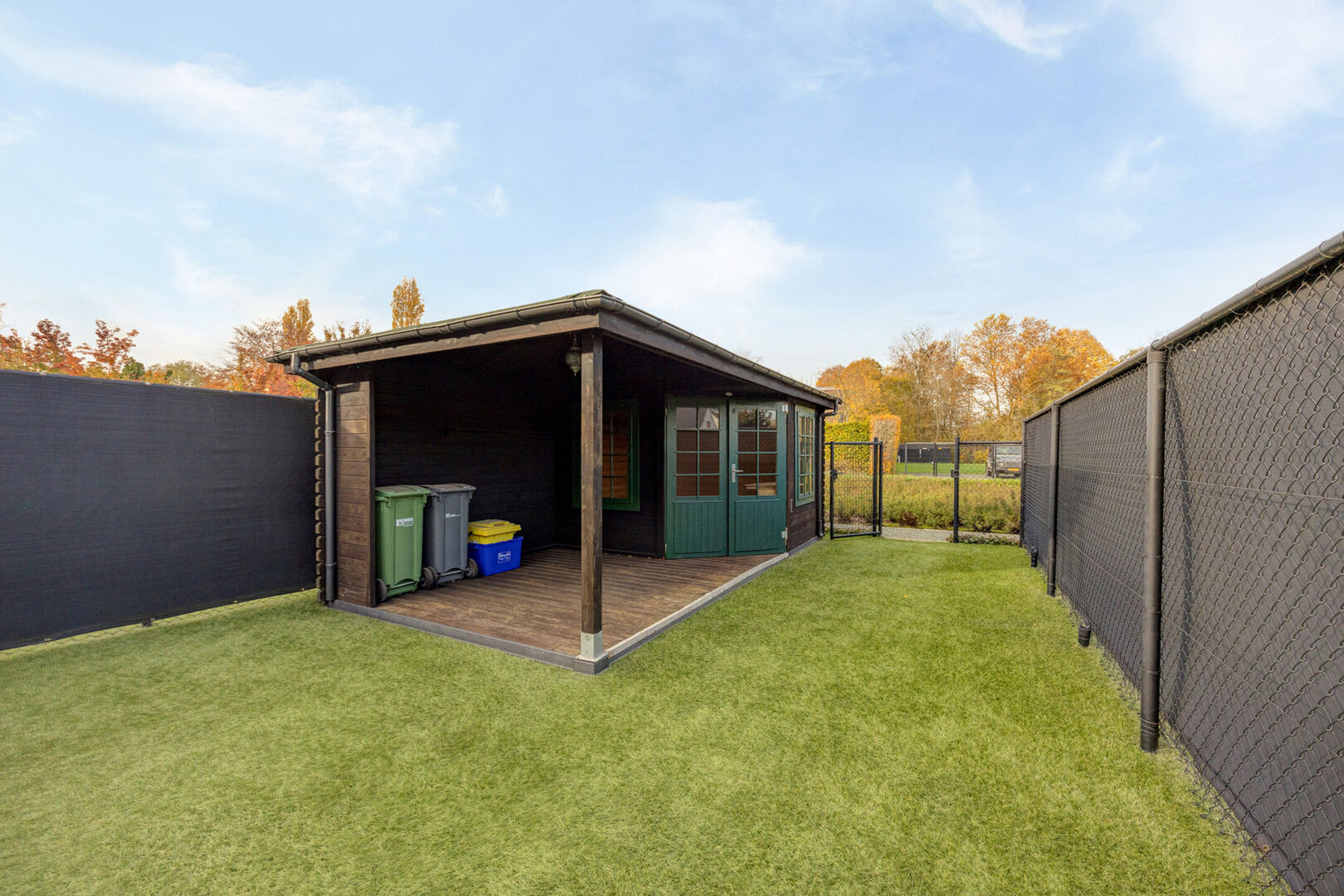 De achtertuin is onderhoudsvriendelijk en volledig omheind, aangelegd met sierbestrating, kunstgras en een tuinhuis met een afdak waar u gezellig kunt ontspannen.