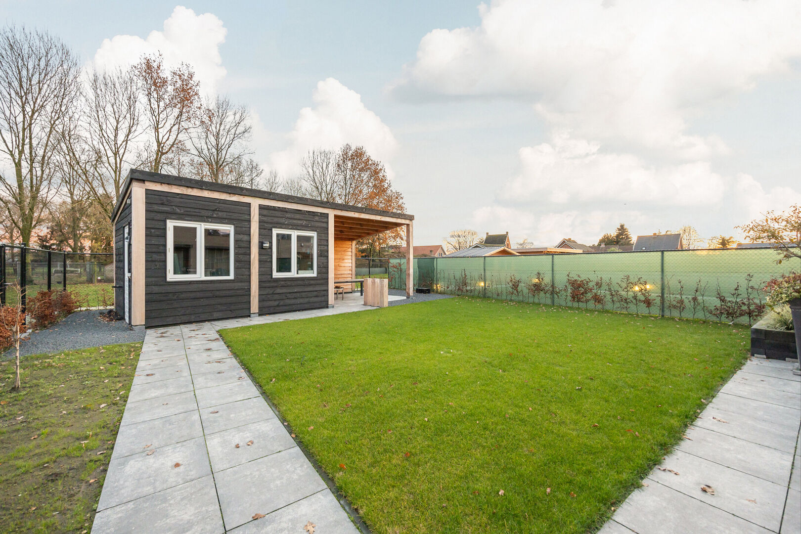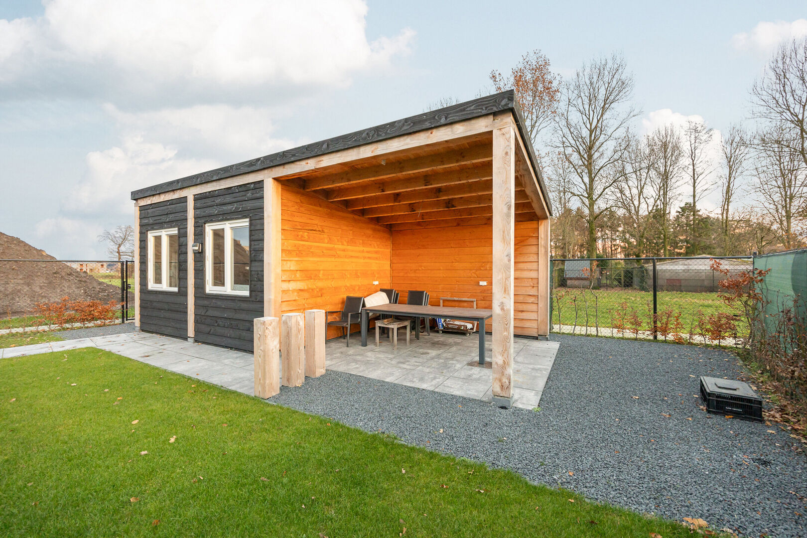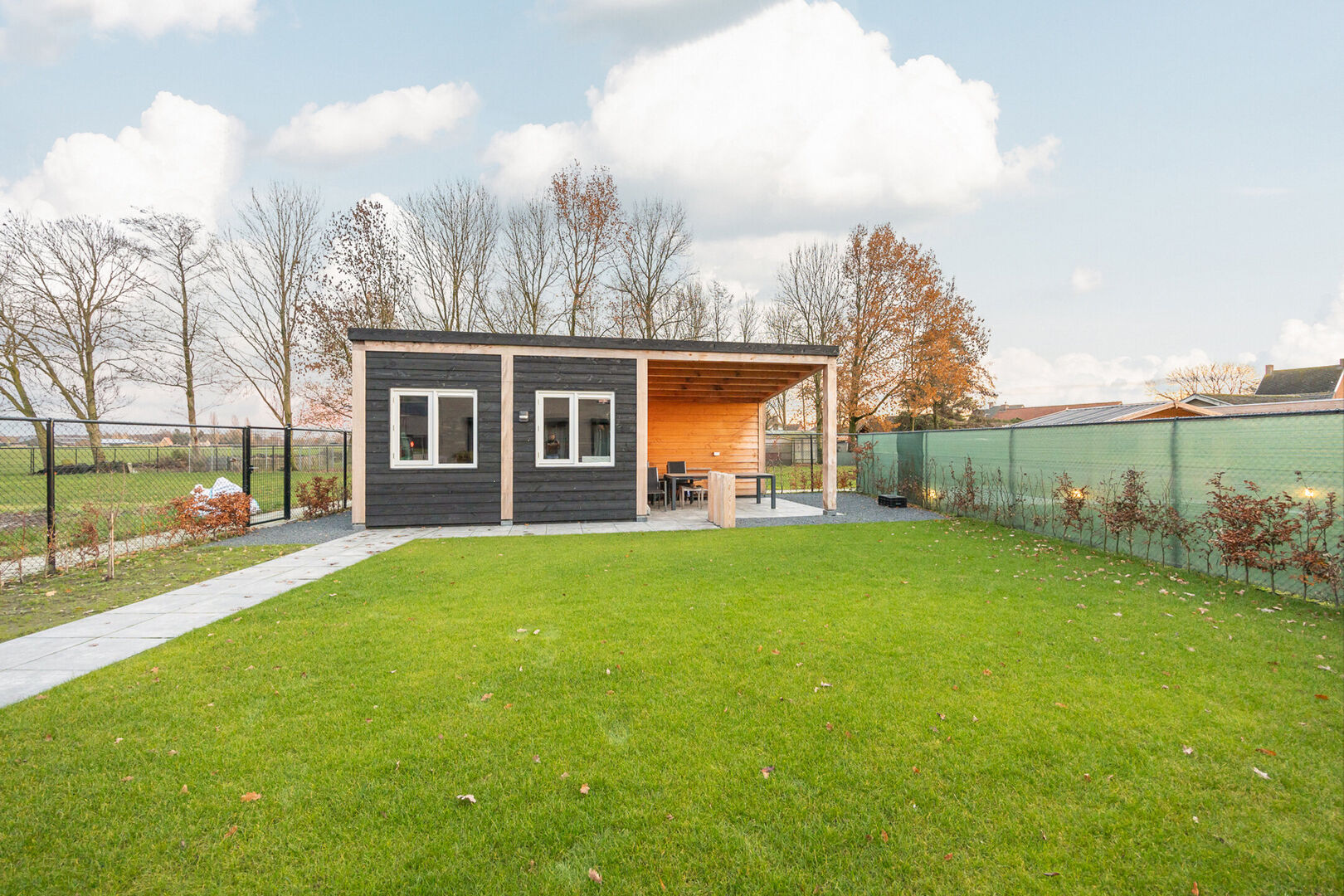 Achteraan de woning komen we in de zonnige en onderhoudsvriendelijke tuin met prachtig weids uitzicht, waar een berging met overdekt terras gedeelte is geplaatst. De berging is ook toegankelijk via een dubbele poort aan de zijkant van de woning.