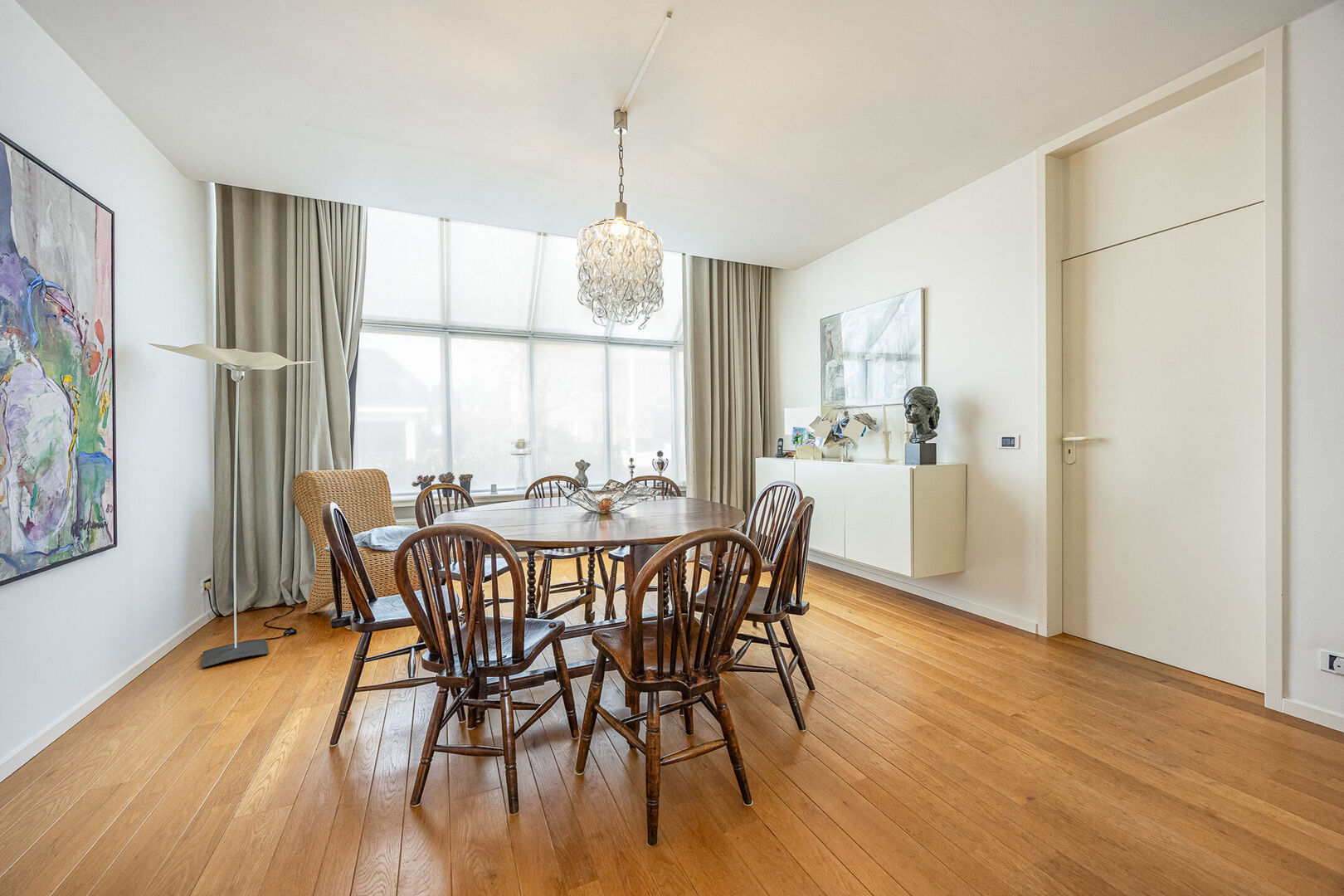 Tevens is er op het gelijkvloers een master bedroom aanwezig uitgerust met een houten parketvloer en rolluik met aansluitend een dressing en ensuite badkamer met vloerverwarming, ligbad, inloopdouche, brede lavabo en toilet.